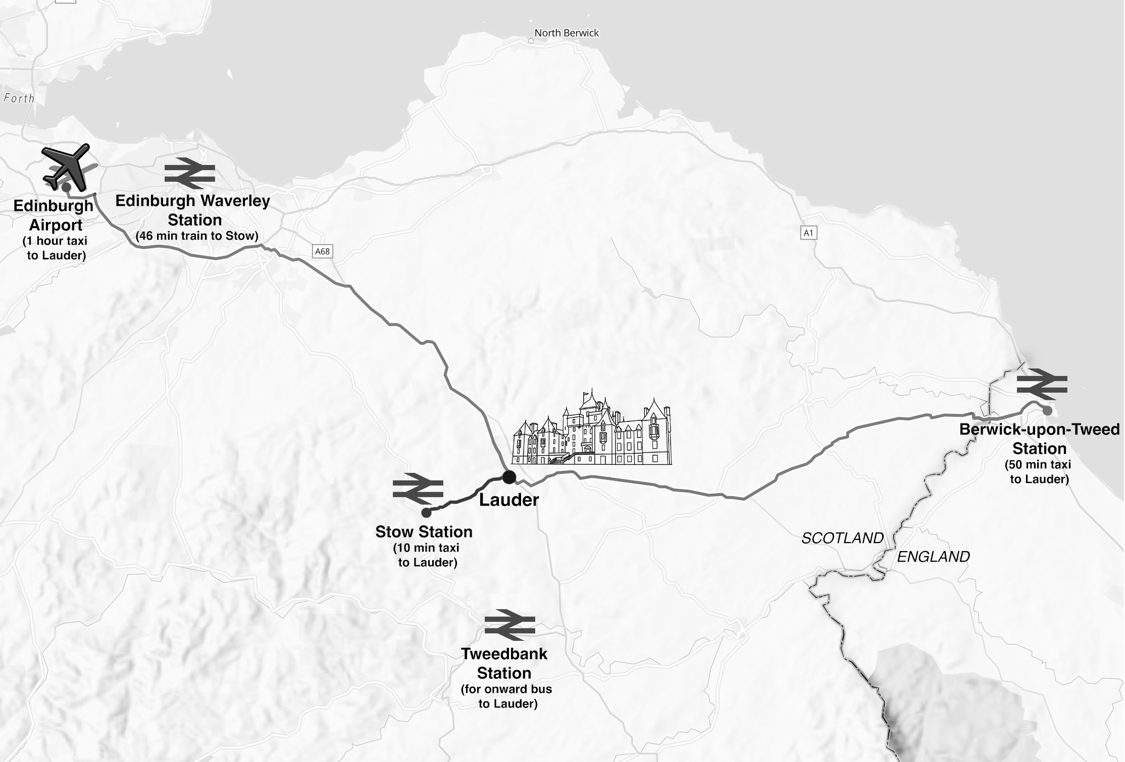 Fly to Edinburgh Airport, and then take a taxi to Lauder (uber available).
